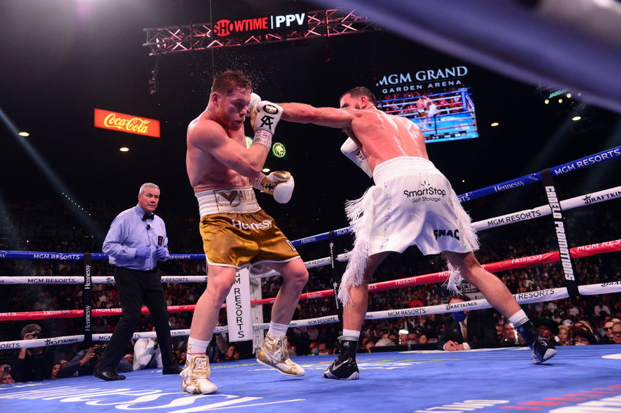 Nov 6, 2021; Las Vegas, Nevada, USA; Canelo Alvarez (gold/white trunks) and Caleb Plant (white/gray trunks) box during their undisputed super middleweight world championship boxing match at MGM Grand Garden Arena. Mandatory Credit: Joe Camporeale-USA TODAY Sports