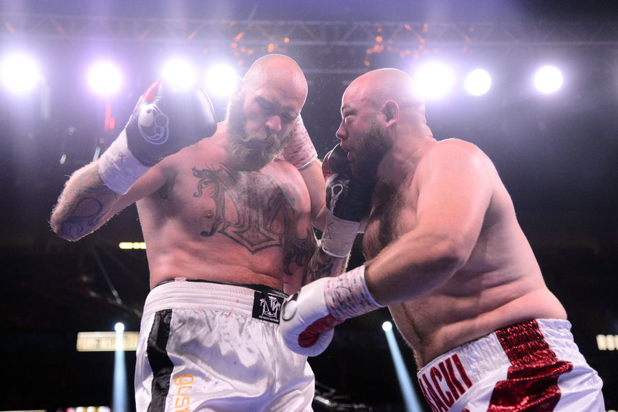 Oct 9, 2021; Las Vegas, Nevada, USA; Adam Kownacki (white/red trunks) and Robert Helenius (white/black trunks) during their heavyweight boxing match. T-Mobile Arena. Mandatory Credit: Joe Camporeale-USA TODAY Sports