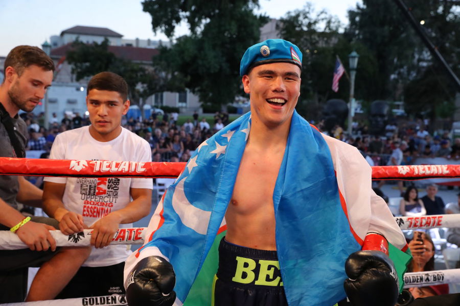 PASADENA, CA – AUGUST 30: Bektemir Melikuziev celebrates his victory over Ricardo Adrian Luna Flores at Pasadena City Hall on August 30, 2019 in Pasadena, California. (Photo by Tom Hogan/Golden Boy/Getty Images)