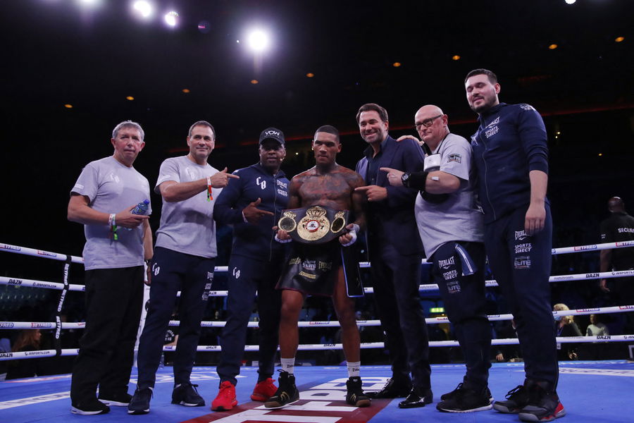 Chris Eubank Jr. (R) of Great Britain and his coach and father Chris Eubank (M) stand together after their victory at the super middleweight quarterfinals of the IBO Boxing World Cup in Stuttgart, Germany, 7 October 2017. Photo: Marijan Murat/dpa (Photo by Marijan Murat/picture alliance via Getty Images)