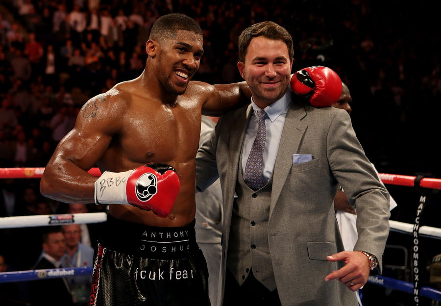 LONDON, ENGLAND – MAY 30: Anthony Joshua of England poses with Promoter Eddie Hearn following his WBC International Heavyweight bout against Kevin Johnson of The USA at The O2 Arena on May 30, 2015 in London, England. (Photo by Ben Hoskins/Getty Images)