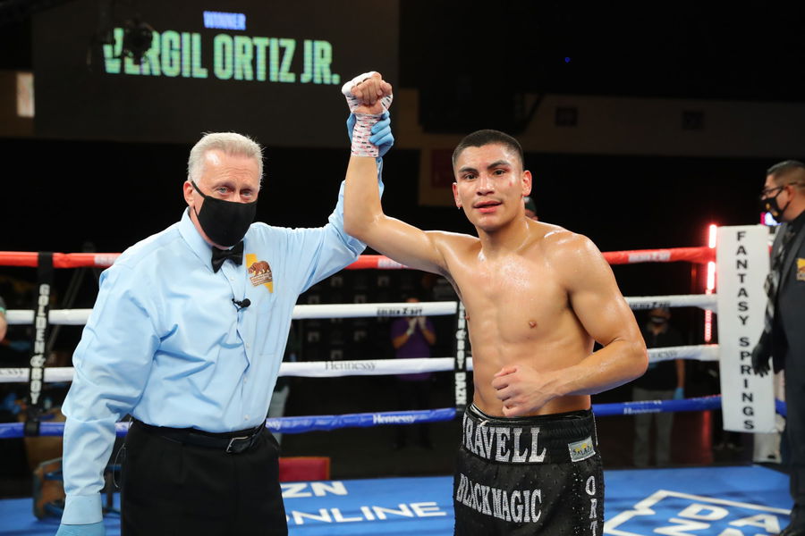 INDIO, CA – JULY 24: Vergil Ortiz (R) celebrates his knock-out victory over Jeremy Ramos at Fantasy Springs Casino on July 24, 2020 in Indio, California. (Photo by Tom Hogan/Golden Boy/Getty Images)