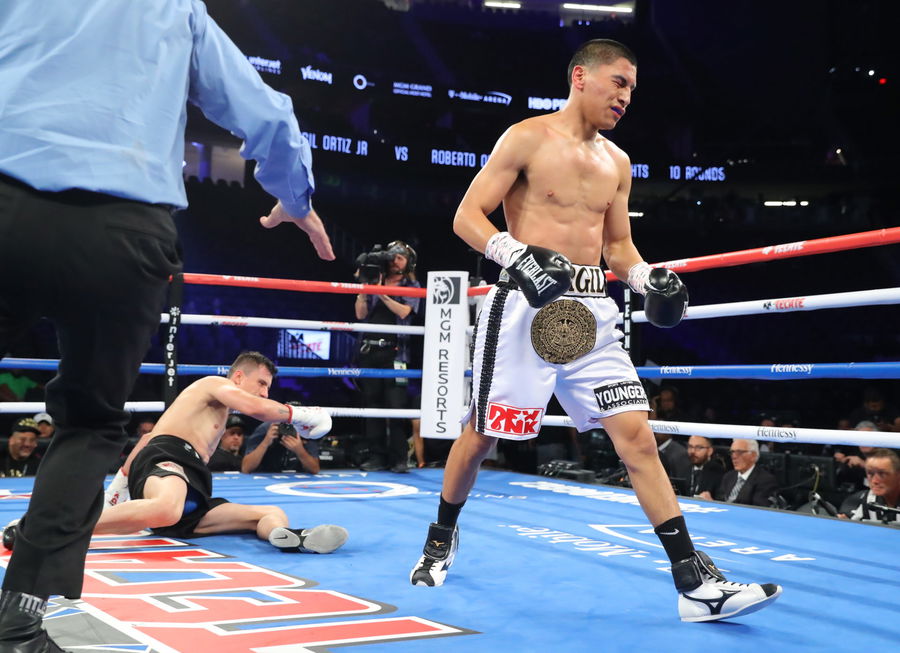 LAS VEGAS, NV – SEPTEMBER 15: (R-L) Vergil Ortiz Jr. walks away after knocking down Roberto Ortiz with a right hand during their super lightweight fight at T-Mobile Arena on September 15, 2018 in Las Vegas, Nevada. (Photo by Tom Hogan/Golden Boy/Getty Images)
