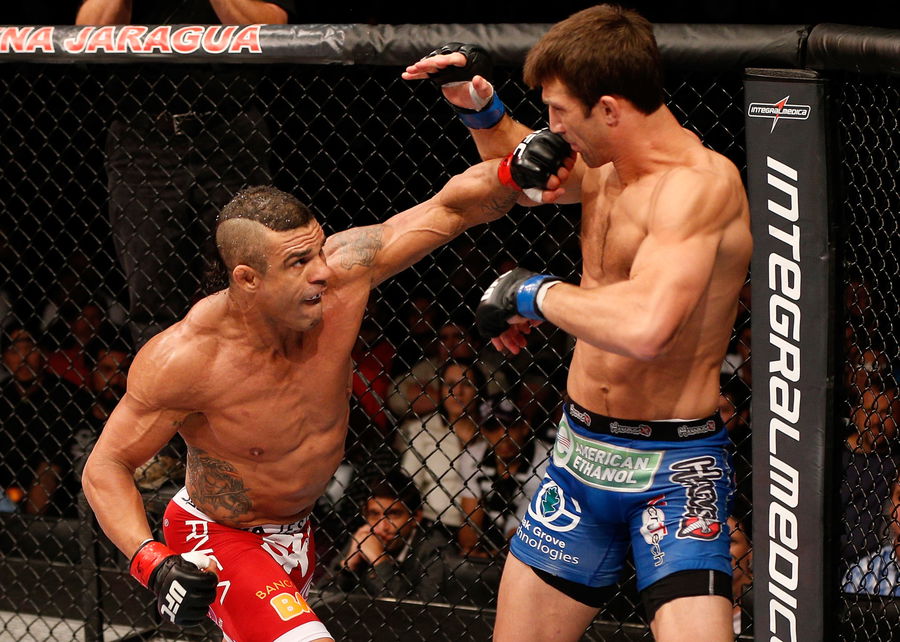 JARAGUA DO SUL, BRAZIL – MAY 18: (L-R) Vitor Belfort punches Luke Rockhold in their middleweight bout during the UFC on FX event on May 18, 2013 at Arena Jaragua in Jaragua do Sul, Santa Catarina, Brazil. (Photo by Josh Hedges/Zuffa LLC/Zuffa LLC via Getty Images)