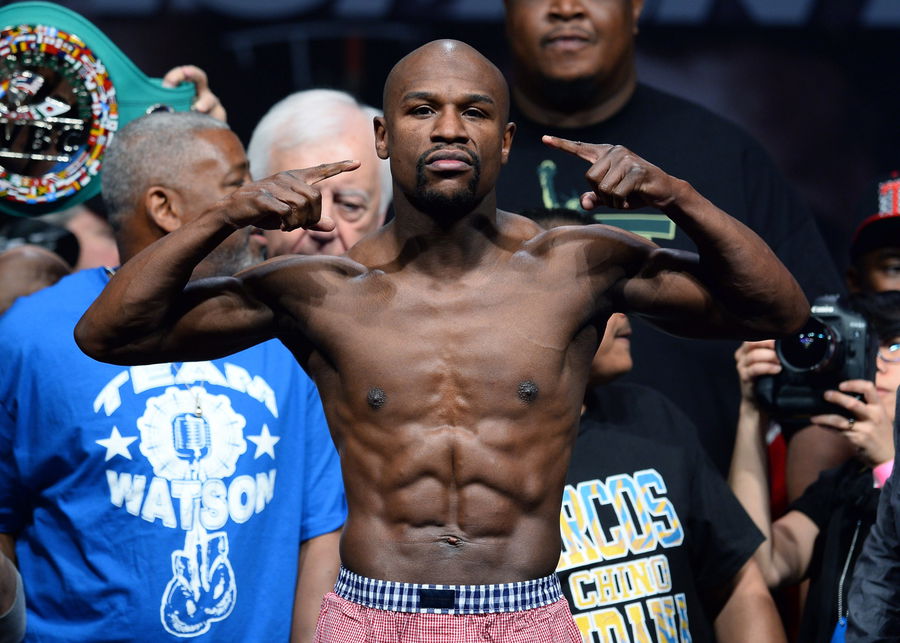 LAS VEGAS, NV – MAY 02: WBC welterweight champion Floyd Mayweather Jr. poses on the scale during his official weigh-in at the MGM Grand Garden Arena on May 2, 2014 in Las Vegas, Nevada. Mayweather will meet WBA champion Marcos Maidana in a WBC/WBA unification fight in Las Vegas on May 3. (Photo by Ethan Miller/Getty Images)