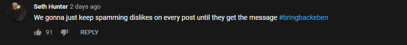 ”We gonna just keep spamming dislikes on every post until they get the message #bringbackeben” wrote another fan.