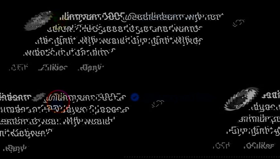 In response, Hearn wrote, “A huge number of PPV buys? I pose a similar question to you. Why would Fury fight Agit Kabayel?”