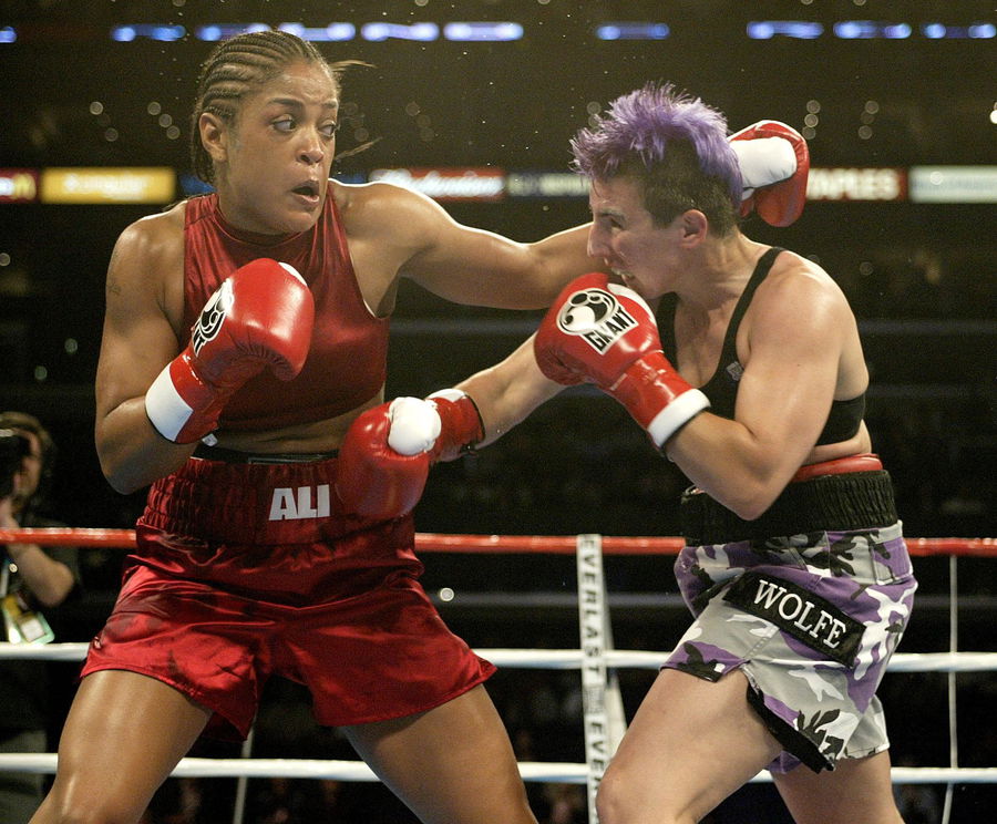 Muhammed Ali’s daughter Laila Ali (left) during her TKO 6th round victory over Valerie Mahfood, at Super-Middleweight at the Staples Centre Arena in Los Angeles. (Photo by Nick Potts – PA Images/PA Images via Getty Images)