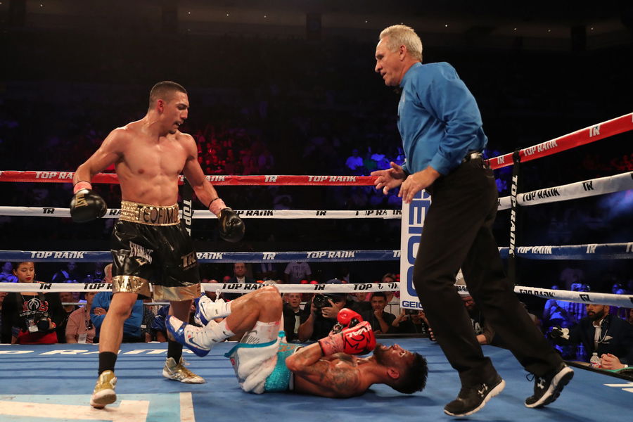 NEW ORLEANS, LA – JULY 14: Teofimo Lopez (L) knocks down Willian Silva during the Regis Prograis v Juan Jose Velasco ESPN boxing match at the UNO Lakefront Arena on July 14, 2018 in New Orleans, Louisiana. (Photo by Alex Menendez/Getty Images)