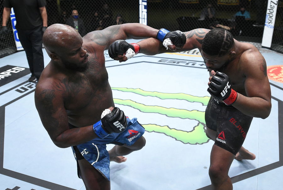 LAS VEGAS, NEVADA – FEBRUARY 20: (L-R) Derrick Lewis and Curtis Blaydes trade punches in a heavyweight bout during the UFC Fight Night event at UFC APEX on February 20, 2021 in Las Vegas, Nevada. (Photo by Chris Unger/Zuffa LLC)