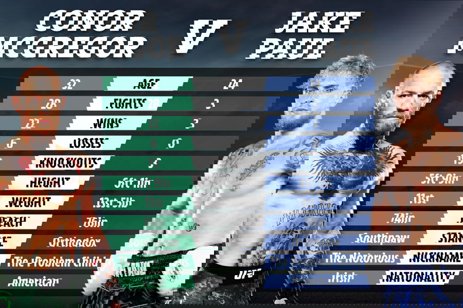 Paul walks around at a 6’1 height, 190 lbs weight, and a 76-inch reach. McGregor is 5’9, has never competed above 170 pounds, and has a 74-inch reach.