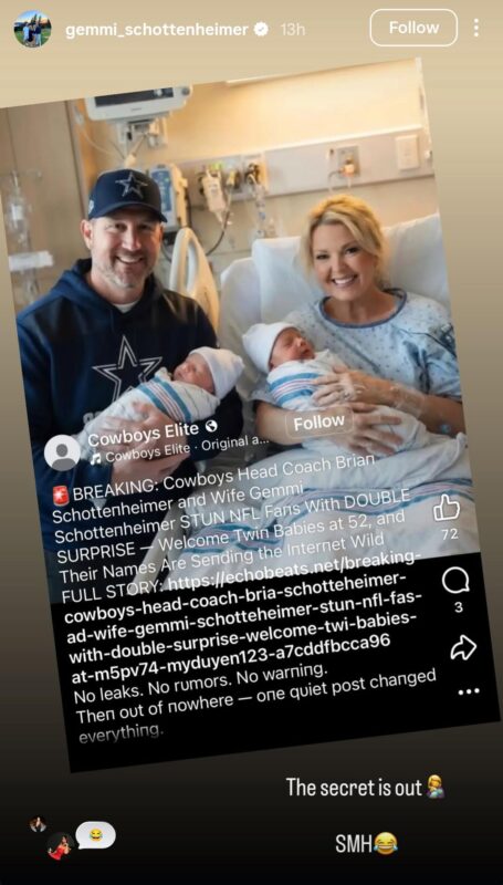 “The secret is out, SMH,” wrote Gemmi in her recent Instagram story, sharing a fan post that claimed that she and Brian Schottenheimer recently welcomed twin children.