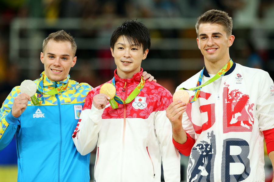 RIO DE JANEIRO, BRAZIL – AUGUST 10: (L to R) Silver medalist Oleg Verniaiev of UkraineGold medalist Kohei Uchimura of Japan and bronze medalist Max Whitlock of Great Britain pose for photographs after the medal ceremony for the Men’s Individual All-Around on Day 5 of the Rio 2016 Olympic Games at the Rio Olympic Arena on August 10, 2016, in Rio de Janeiro, Brazil. (Photo by Alex Livesey/Getty Images)