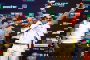 BEVERLY HILLS, CALIFORNIA – SEPTEMBER 21: (L-R) Canelo Alvarez and Caleb Plant during a face-off before a press conference ahead of their super middleweight fight on November 6 at The Beverly Hilton on September 21, 2021 in Beverly Hills, California. (Photo by Ronald Martinez/Getty Images)