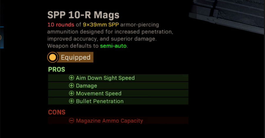 The description for the attachment reads, “10 rounds of 9x39mm SPP armor-piercing ammunition designed for increased penetration, improved accuracy, and superior damage.”