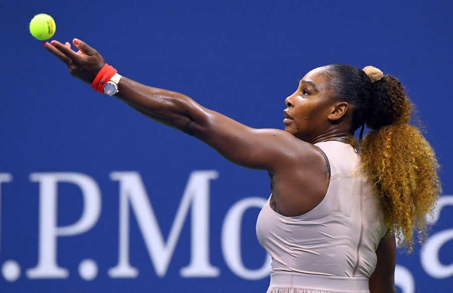 Serena Williams serves the ball against Victoria Azarenka in the women’s singles semifinals at 2020 U.S. Open | Reuters