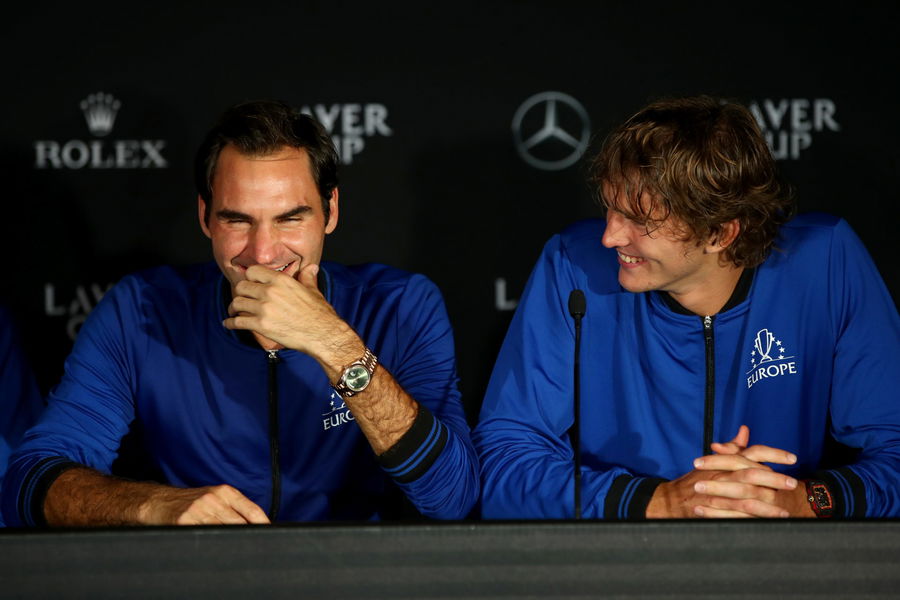 CHICAGO, IL – SEPTEMBER 23: Team Europe Roger Federer of Switzerland and Team Europe Alexander Zverev of Germany speak to the media after their Men’s Singles match on day three of the 2018 Laver Cup at the United Center on September 23, 2018 in Chicago, Illinois. (Photo by Clive Brunskill/Getty Images for The Laver Cup)