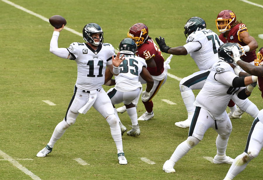Sep 13, 2020; Landover, Maryland, USA; Philadelphia Eagles quarterback Carson Wentz (11) attempts a pass against the Washington Football Team during the second half quarter at FedExField. Mandatory Credit: Brad Mills-USA TODAY Sports