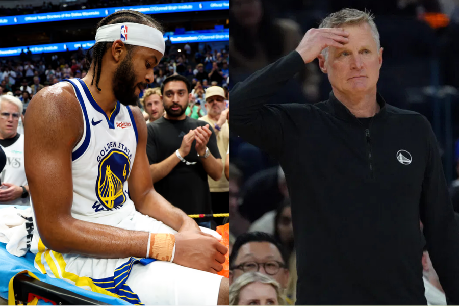 Head coach Steve Kerr reacts after an unfortunate no-contact injury to Golden State Warriors star Moses Moody.