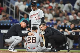 In the Nippon Professional Baseball league, a Hanshin Tigers outfielder had to exit the game mid-way after a brutal hit-by-pitch.