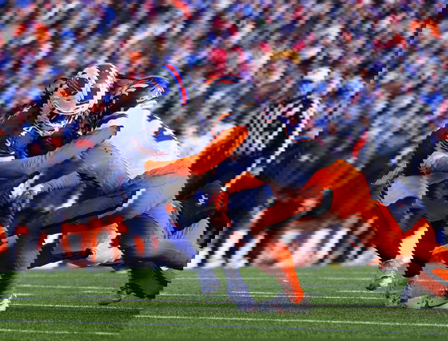 NFL, American Football Herren, USA AFC Wild Card Round-Denver Broncos at Buffalo Bills Jan 12, 2025 Orchard Park, New York, USA Buffalo Bills running back James Cook 4 is tackled by Denver Broncos cornerback Riley Moss 21 during the second quarter in an AFC wild card game at Highmark Stadium. Orchard Park Highmark Stadium New York USA, EDITORIAL USE ONLY PUBLICATIONxINxGERxSUIxAUTxONLY Copyright: xGregoryxFisherx 20250112_tcs_es2_071