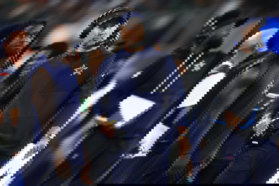 ATLANTA, GA Ð NOVEMBER 03: Dallas quarterback Dak Prescott 4 greets his linemen Cooper Beebe 56 and Brock Hoffman 67 as they enter the field prior to the start of the NFL, American Football Herren, USA game between the Dallas Cowboys and the Atlanta Falcons on November 3rd, 2024 at Mercedes-Benz Stadium in Atlanta, GA. Photo by Rich von Biberstein/Icon Sportswire NFL: NOV 03 Cowboys at Falcons EDITORIAL USE ONLY Icon241103090