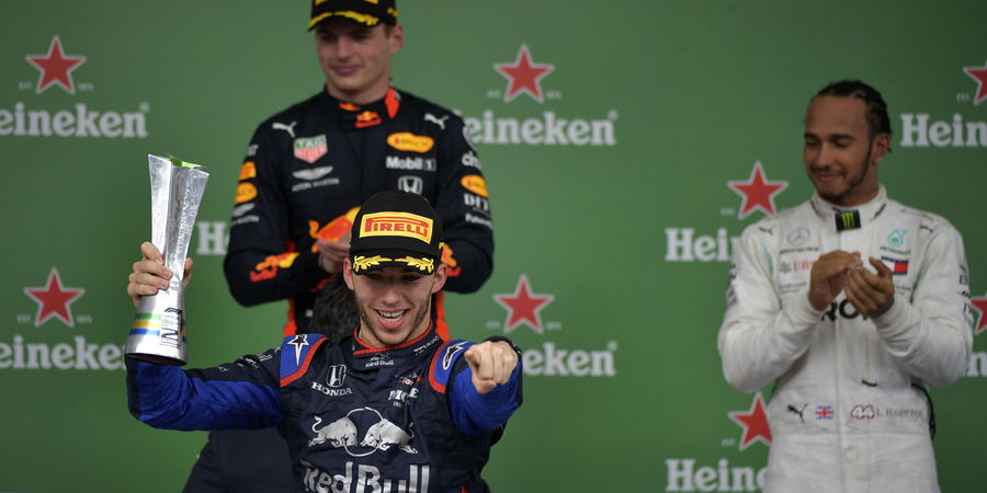 Toro Rosso's French driver Pierre Gasly celebrates at the podium after getting the second place in the F1 Brazil Grand Prix, at the Interlagos racetrack in Sao Paulo, Brazil on November 17, 2019. (Photo by Carl DE SOUZA / AFP)