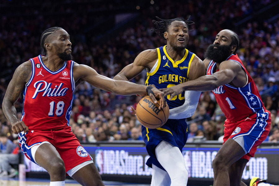 Dec 16, 2022; Philadelphia, Pennsylvania, USA; Philadelphia 76ers guard James Harden (1) and guard Shake Milton (18) steal the ball from Golden State Warriors forward Jonathan Kuminga (00) during the second quarter at Wells Fargo Center. Mandatory Credit: Bill Streicher-USA TODAY Sports