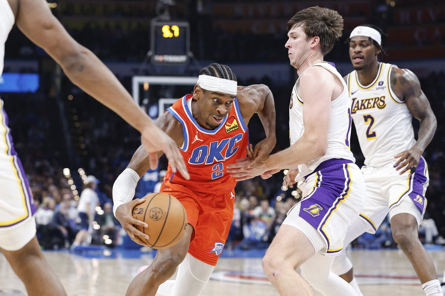 Dec 23, 2023; Oklahoma City, Oklahoma, USA; Oklahoma City Thunder guard Shai Gilgeous-Alexander (2) drives around Los Angeles Lakers guard Austin Reaves (15) during the second half at Paycom Center. Mandatory Credit: Alonzo Adams-USA TODAY Sports