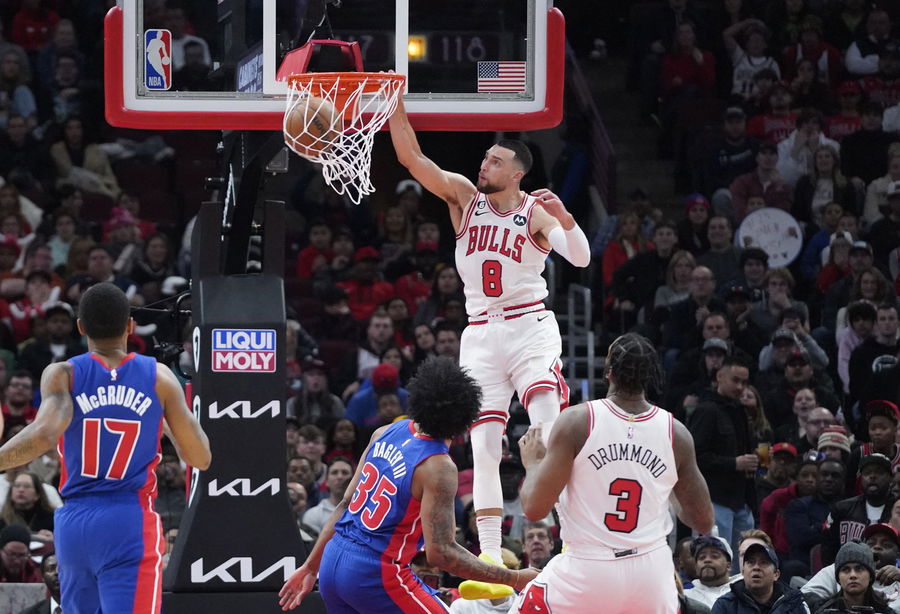 Dec 30, 2022; Chicago, Illinois, USA; Chicago Bulls guard Zach LaVine (8) dunks the ball against the Detroit Pistons during the first quarter at United Center. Mandatory Credit: David Banks-USA TODAY Sports