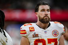 Oct 27, 2024; Paradise, Nevada, USA; Kansas City Chiefs tight end Travis Kelce (87) reacts after the game against the Las Vegas Raiders at Allegiant Stadium. Mandatory Credit: Kirby Lee-Imagn Images