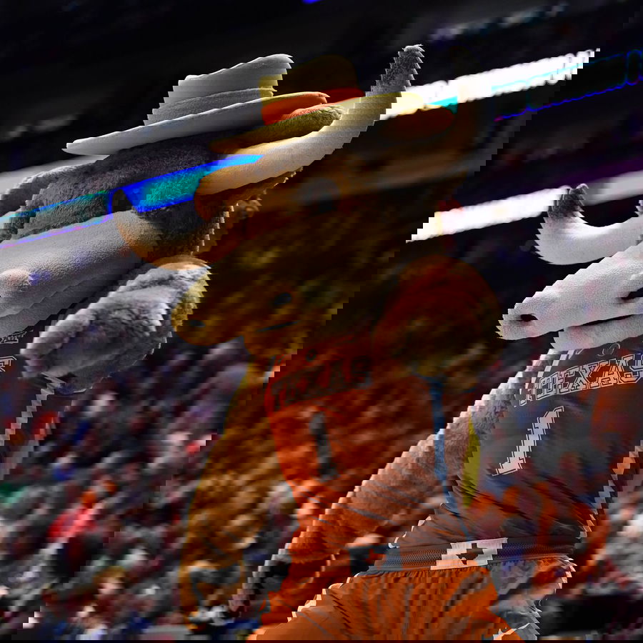 The costumed mascot is called Hook'Em. It was launched in 1977, during a basketball game between Texas and Oklahoma.