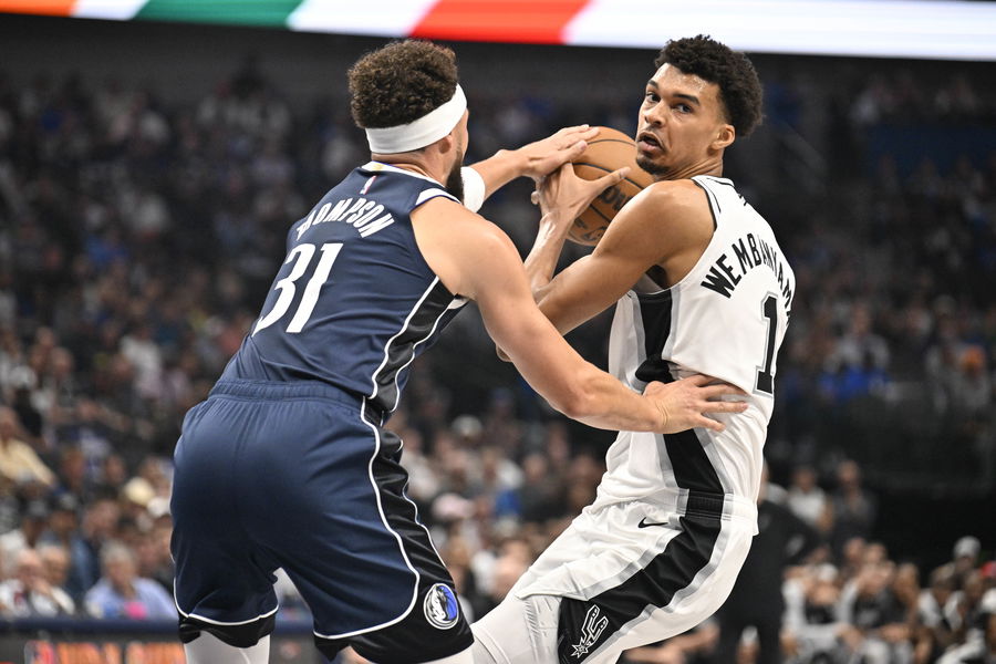 Oct 24, 2024; Dallas, Texas, USA; Dallas Mavericks guard Klay Thompson (31) knocks the ball away from San Antonio Spurs center Victor Wembanyama (1) during the first quarter at the American Airlines Center. Mandatory Credit: Jerome Miron-Imagn Images