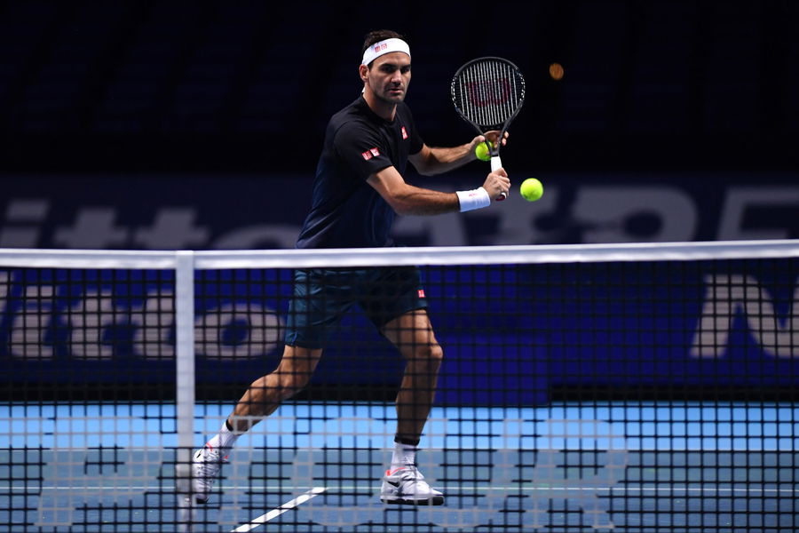 LONDON, ENGLAND – NOVEMBER 09: Roger Federer of Switzerland plays a volley during practice ahead of the Nitto ATP Finals at The O2 Arena on November 09, 2019 in London, England. (Photo by Justin Setterfield/Getty Images)