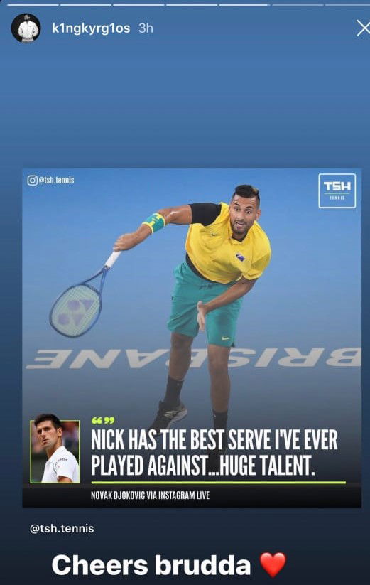 The player who complimented Nick Kyrgios was none other than Novak Djokovic. He complimented him on Instagram live by saying that Nick has the best serve he’s ever played against and that he has a lot of talent. Nick replied to him on his Instagram story with a simple ‘Cheers brudda’.