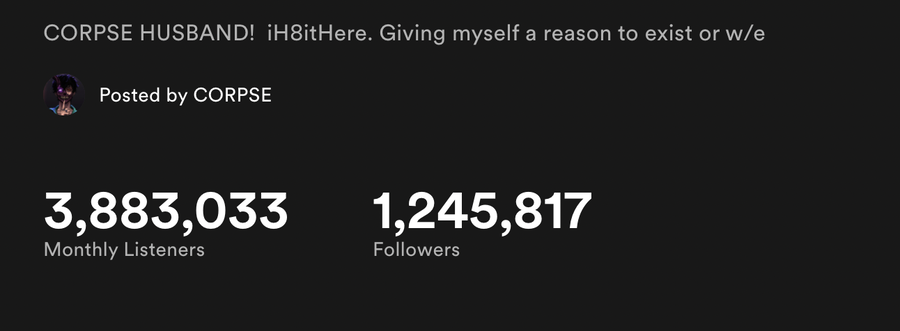 Corpse is not just a popular Among Us streamer but also a successful Spotify artist. He manages about 4 million monthly plays on his current tracks. Additionally, he also has 1.24 million followers on the music streaming platform. This is only around 800K behind his YouTube subscriber count.