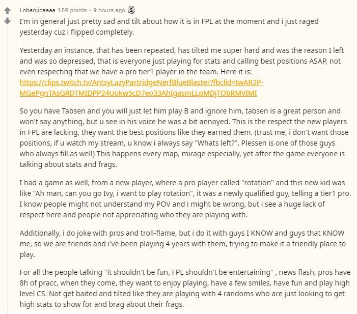 One of the points I feel like he hits the mark perfect with is that we practice so much and therefore when we play fpl we try to have a little bit of fun – Unfortunately it's not entertaining for a lot of pros anymore since it has changed into "Elite fpl-c" as u said