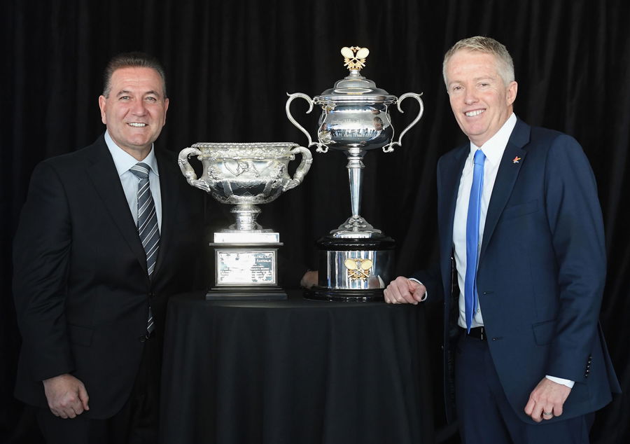 MELBOURNE, AUSTRALIA – OCTOBER 10: The Minister for Sport and Major Events John Eren and Craig Tiley the Australian Open Tournament Director pose with the Australian Open Trophies during the 2018 Australian Open Launch at Tennis HQ on October 10, 2017 in Melbourne, Australia. (Photo by Quinn Rooney/Getty Images)