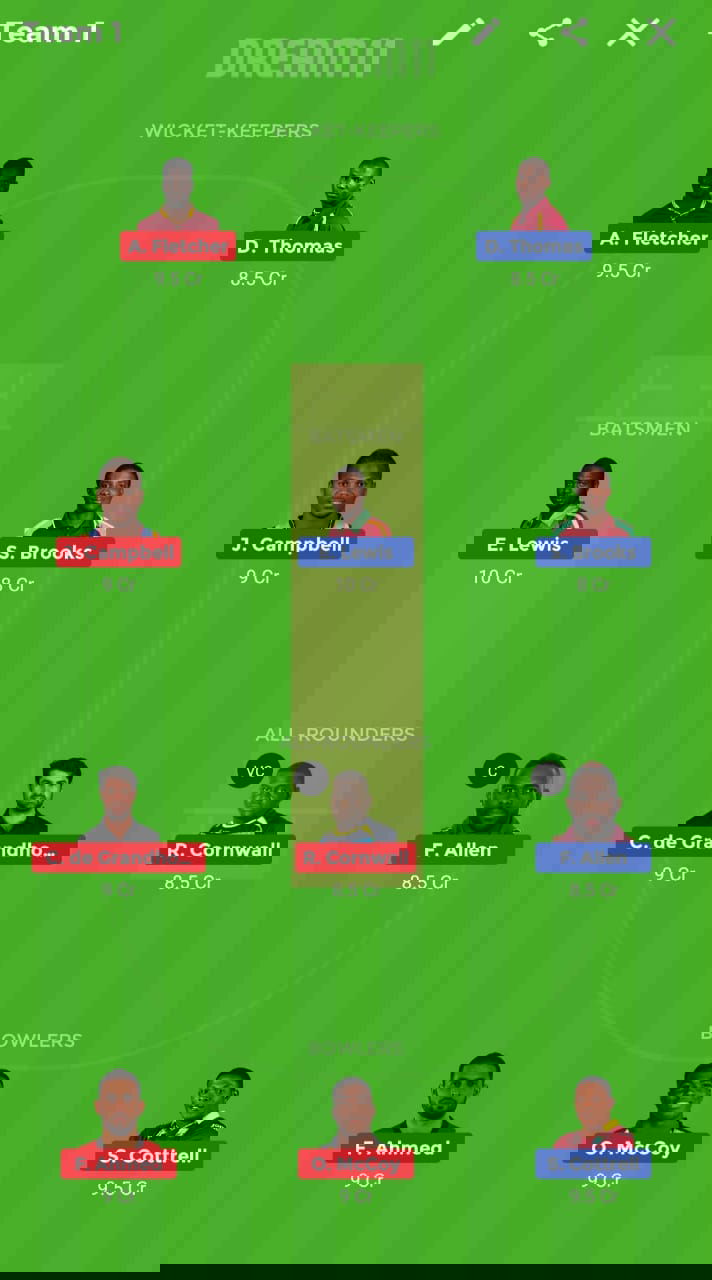 Devon Thomas (wk), Laurie Evans, Jason Mohammed, Mohammad Hafeez, Shamarh Brooks, Fabian Allen, Carlos Brathwaite (c), Rayad Emrit, Sheldon Cottrell, Dominic Drakes, Alzarri Joseph