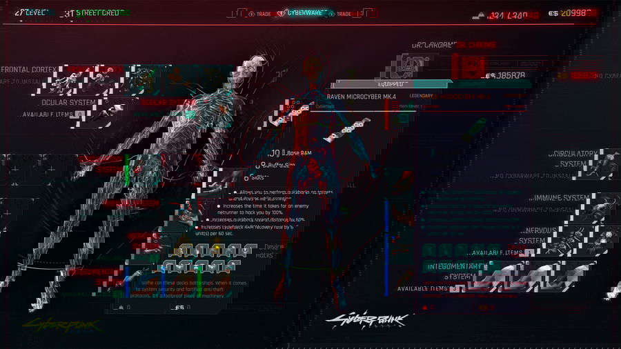 As seen in the picture above players can enhance almost every important biological system in the body with cyberware. Much like upgrading your PC, this will also require a fair amount of in-game currency.