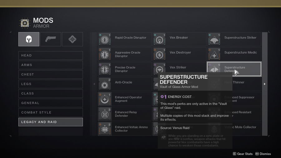 One of the mod that players should use for Master difficulty of Vault of Glass in Destiny 2 is the Superstructure Defender mod. They will require 1 Energy to add it on to Void armor pieces. They can improve its effect by stacking them on to multiple armor pieces. The mod becomes active when players stand on a sync plate or are near a conflux weapon, and weapon attacks that hit powerful Vex combatants have a high chance to weaken them.