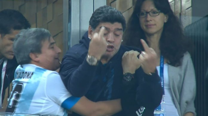 The La Albiceletes had to win the game to qualify for the Knockout Stages and had taken the lead through the mercurial Leo Messi, but were pegged level by a Victor Moses penalty. Maradona, who was watching the game from the stands made no effort to hide his feelings throughout the 90 minutes, expressing a variety of emotions from joy to anger to anguish to utter exhilaration. He capped it off by showing middle fingers to the camera after the late goal as an act of defiance.