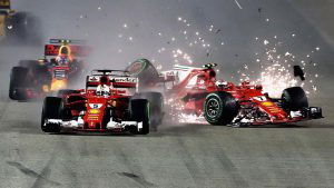 Tailing the Mercedes of Hamilton behind the safety car, the duo made contact which resulted in Vettel losing a portion of his front wing. In a moment of red mist and anger, and under the assumption that Hamilton had brake tested him, the German drew parallel and banged wheels with his rivals.