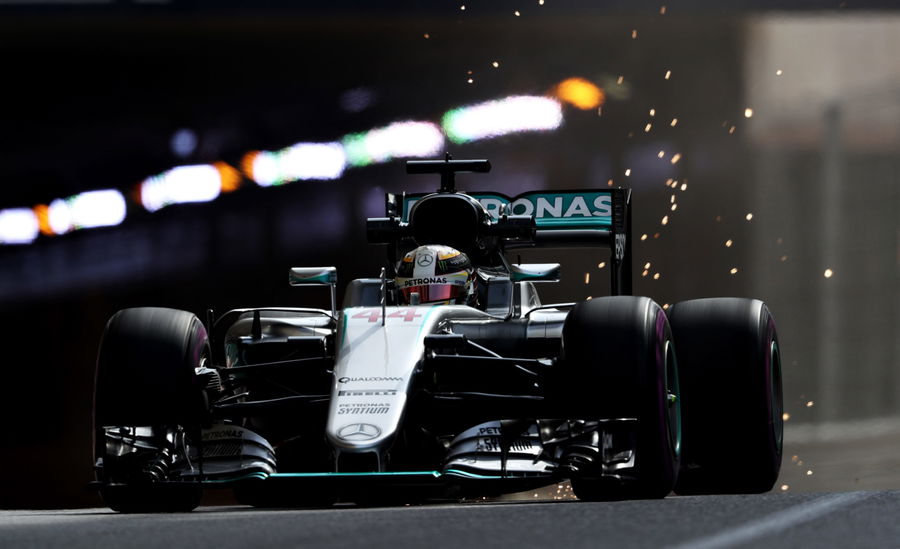 MONTE-CARLO, MONACO – MAY 26: Sparks fly as Lewis Hamilton of Great Britain driving the (44) Mercedes AMG Petronas F1 Team Mercedes F1 WO7 Mercedes PU106C Hybrid turbo on track during practice for the Monaco Formula One Grand Prix at Circuit de Monaco on May 26, 2016 in Monte-Carlo, Monaco. (Photo by Lars Baron/Getty Images)