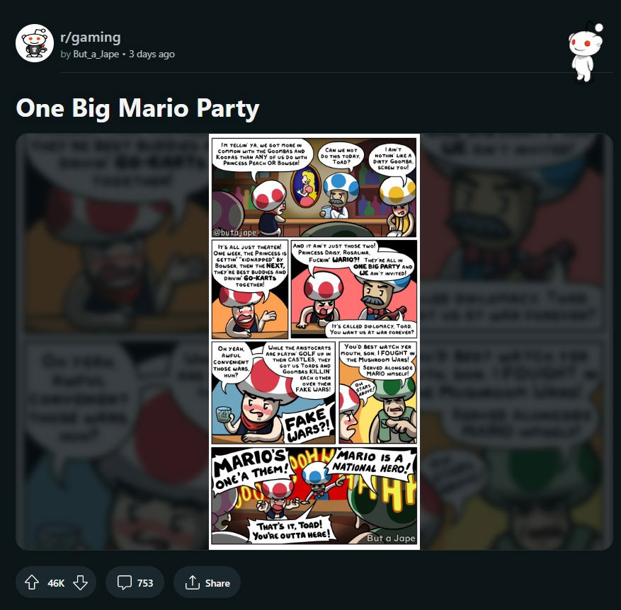 Recently, a Reddit user shared a fan comic imposing the love story of Mario and Princess from the eyes of Toad. Nintendo fans were just left stunned by the creators’ creativity and humor. The relationship between Mario, Princess, and Bowser was defined perfectly, and Toad’s hilarious response entertained several fans.
