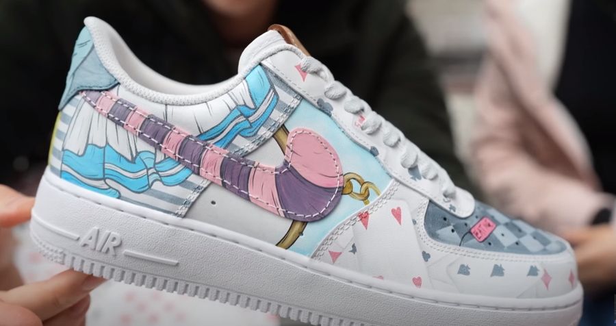 Understanding the mission and themes of the company, Marko designed a pair of Air Force 1. The design of the shoes was inspired by Alice in Wonderland. It had the iconic playing card motifs, foggy veils, the eccentric Mad hatter references, and the mysterious trickster, the Persian Cat.