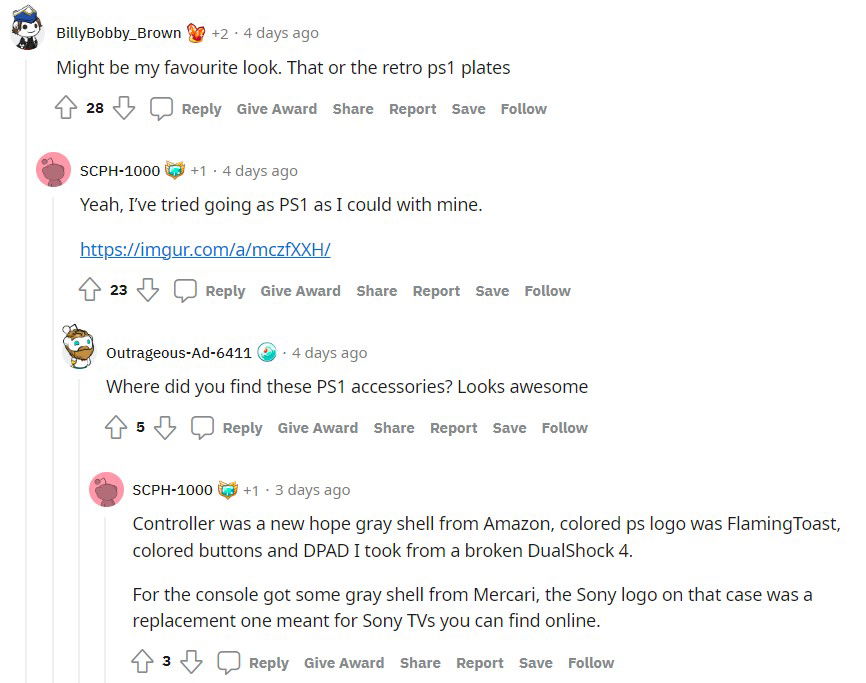 Replying to the question, they wrote that the the “Controller was a new hope gray shell from Amazon, colored ps logo was FlamingToast, colored buttons and DPAD I took from a broken DualShock 4. For the console got some gray shell from Mercari, the Sony logo on that case was a replacement one meant for Sony TVs you can find online.”