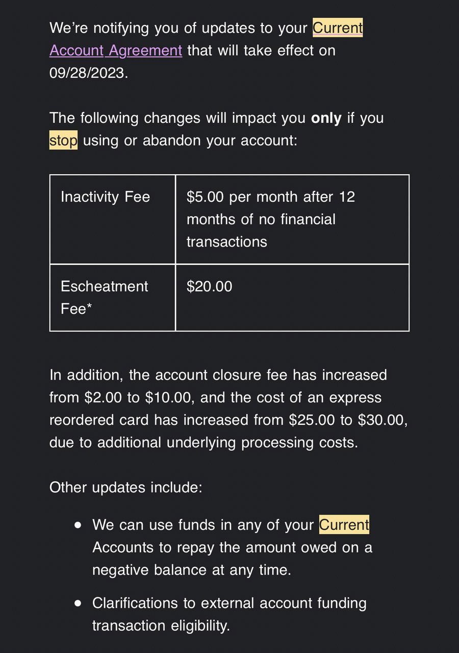 They recently updated their Account Agreement which put a charge of $5 per month on inactive users of over 12 months and an escheatment fee of $20. Furthermore, closing an account would cost the user $10, and express reordering a card would cost $30.