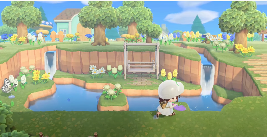 Try to make the corner of the cliff round and also make sure to build a piece of land on the ponds. You can place some flowers on some land portions surrounded by water to make it more beautiful. Other than that, build some free areas near the water. Lastly, you can place some benches or other items to sit on and later watch your beautiful creation.