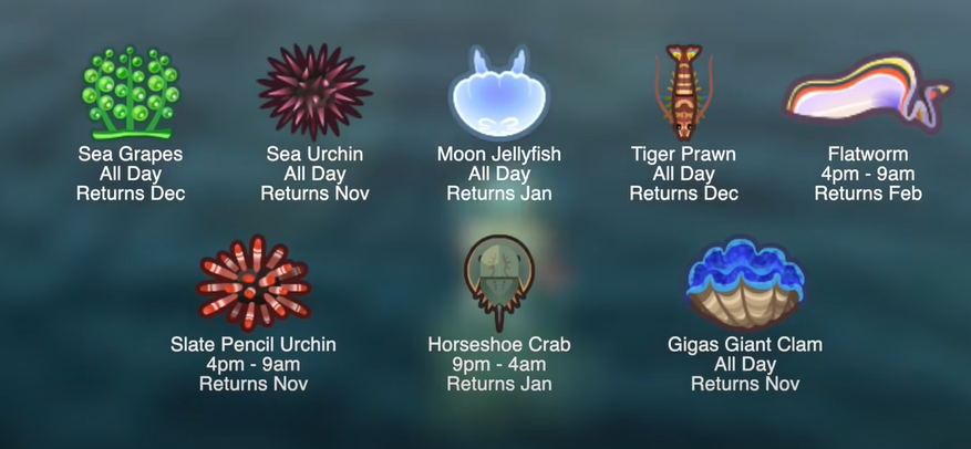 For sea creatures, there will be only one sea creature leaving the northern hemisphere and it will be the Red King Crab. The southern hemisphere will see eight sea-creatures departure. These will be: Sea Grapes, Sea Urchin, Moon Jellyfish, Tiger Prawn, Flatworm, Slate Pencil Urchin, Horseshoe Crab, and Gigas Giant Clam.